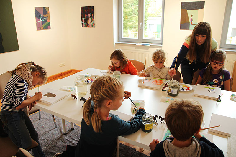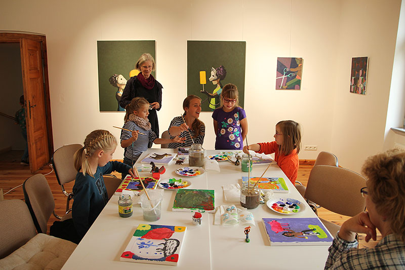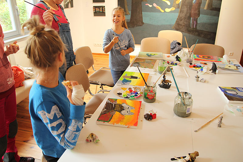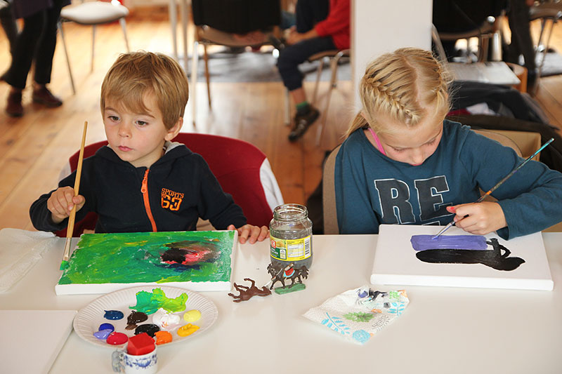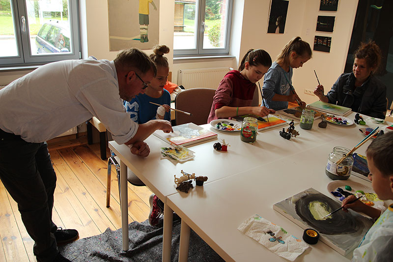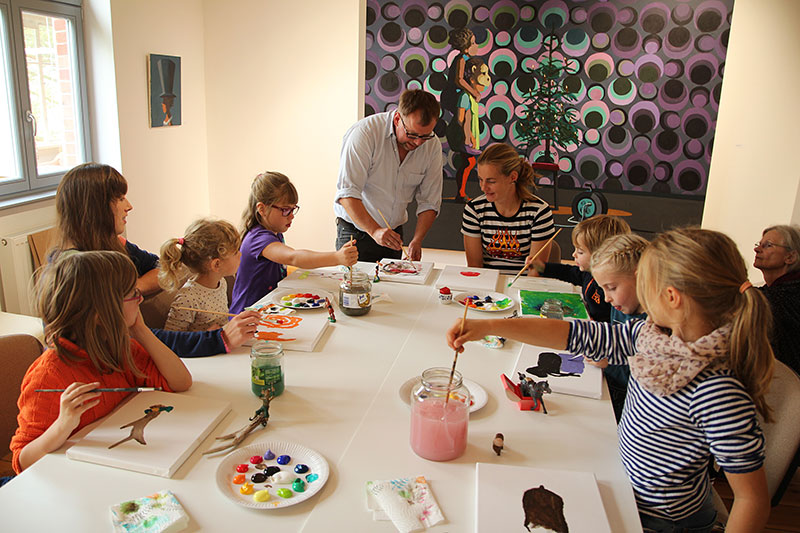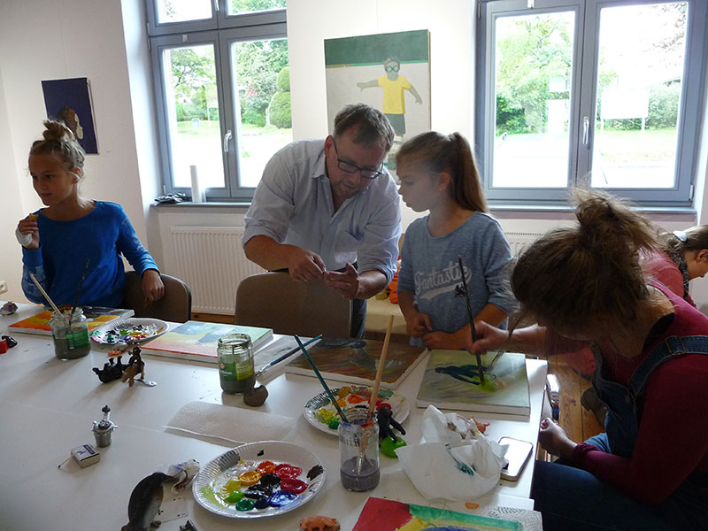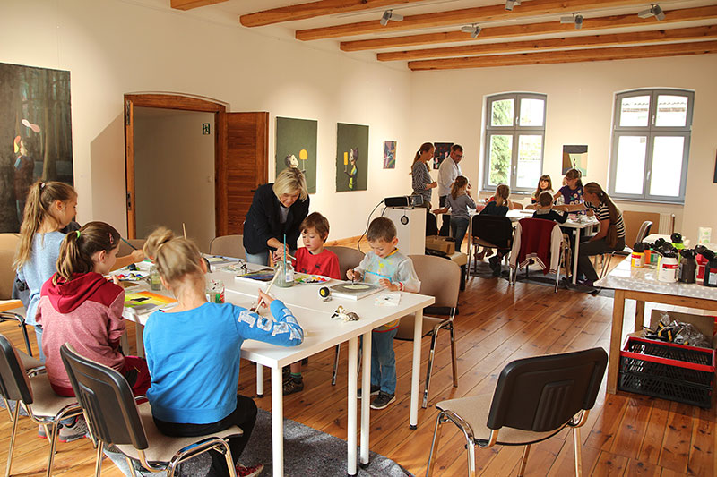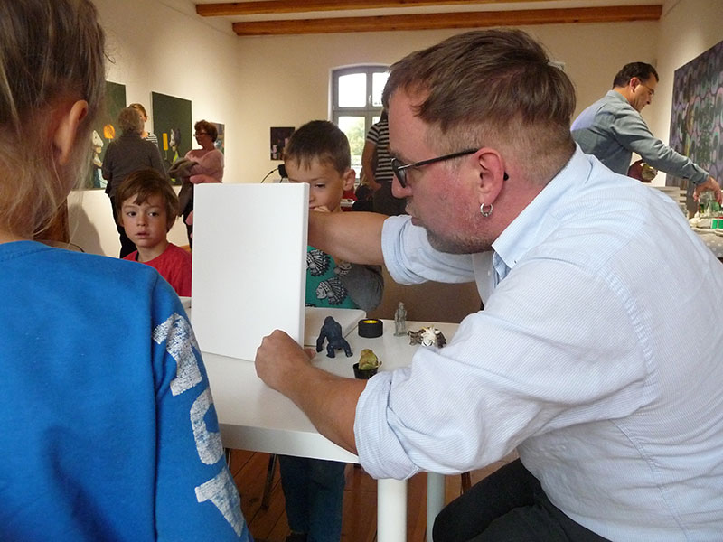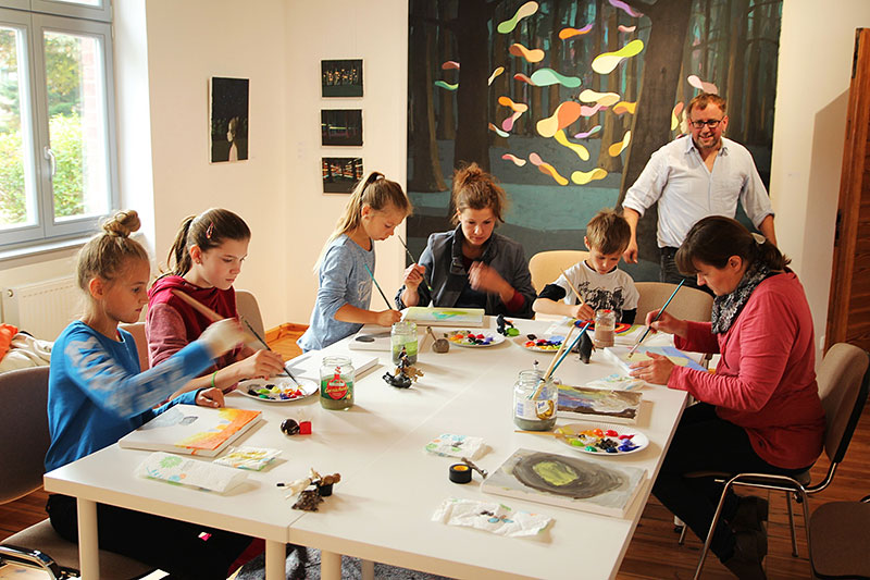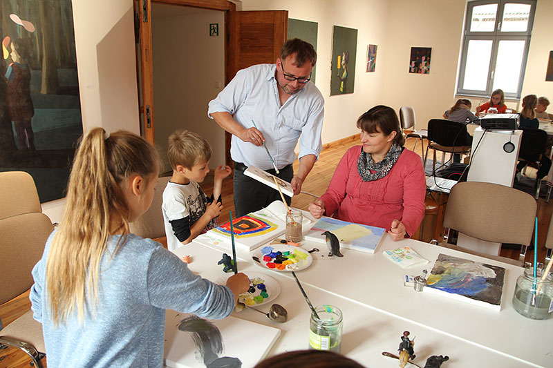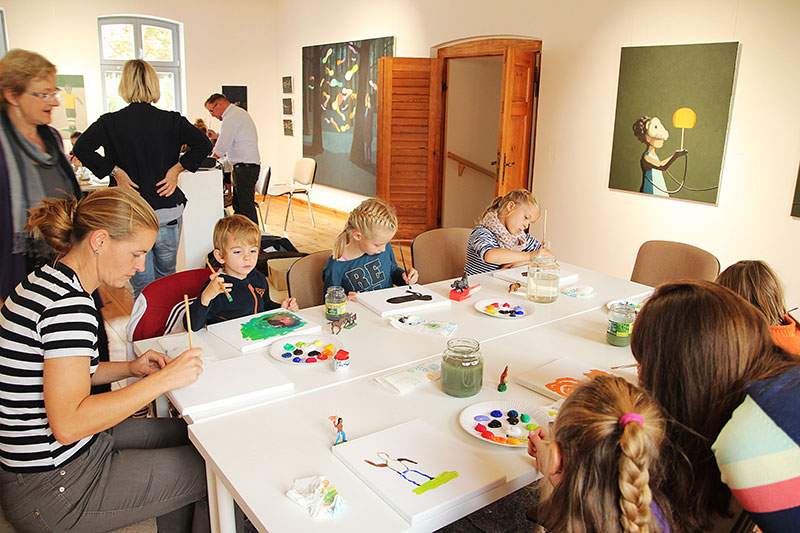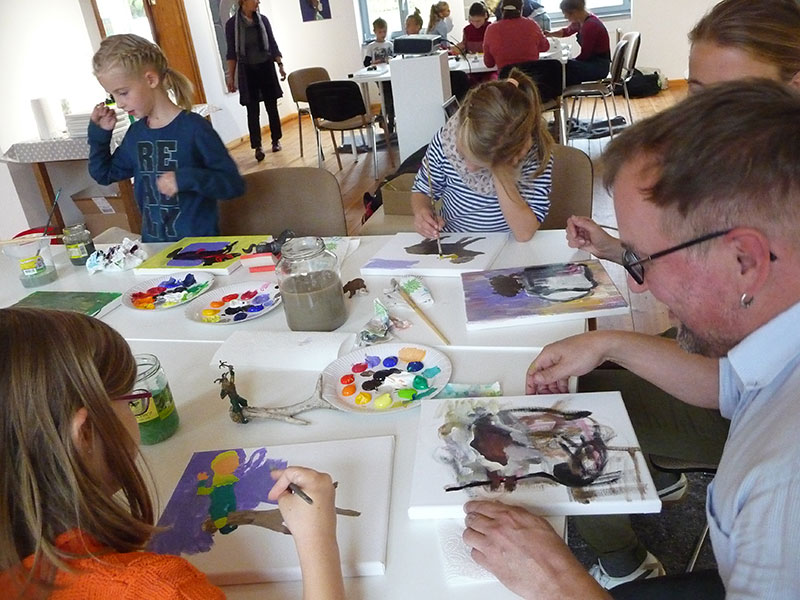 Interessierte Kinder, Jugendliche bzw. Junggebliebene waren herzlich eingeladen, mit dem Künstler über die Bilder seiner Ausstellung zu sprechen, Geheimnisse über Licht und Schatten und die Entwicklung der Bildmotive zu erfahren. Sie konnten selbst mit Pinsel und Farbe aktiv werden. Sven Ochsenreither brachte Leinwände, Acrylfarben und Pinsel mit. Um 14 Uhr sprach der Künstler in einem Vortrag über seine Arbeiten.