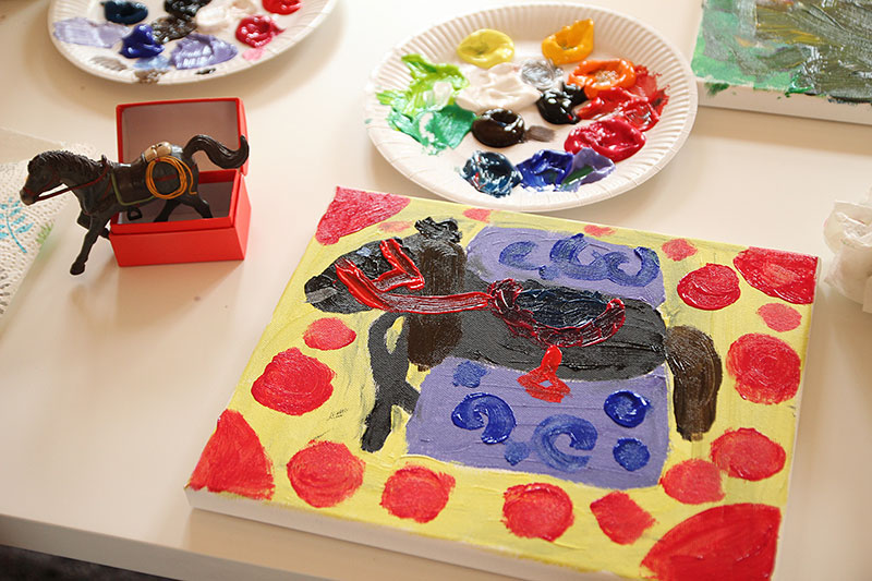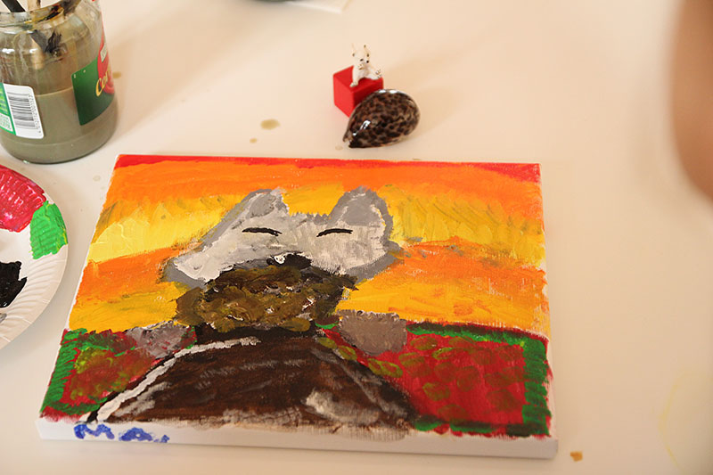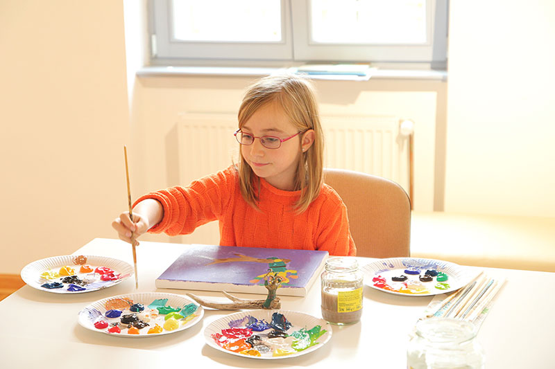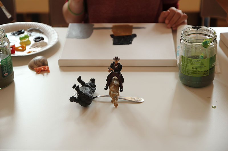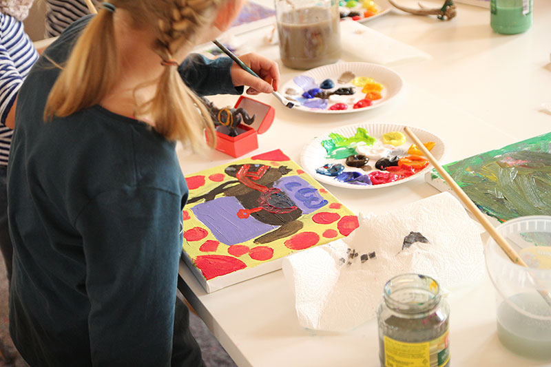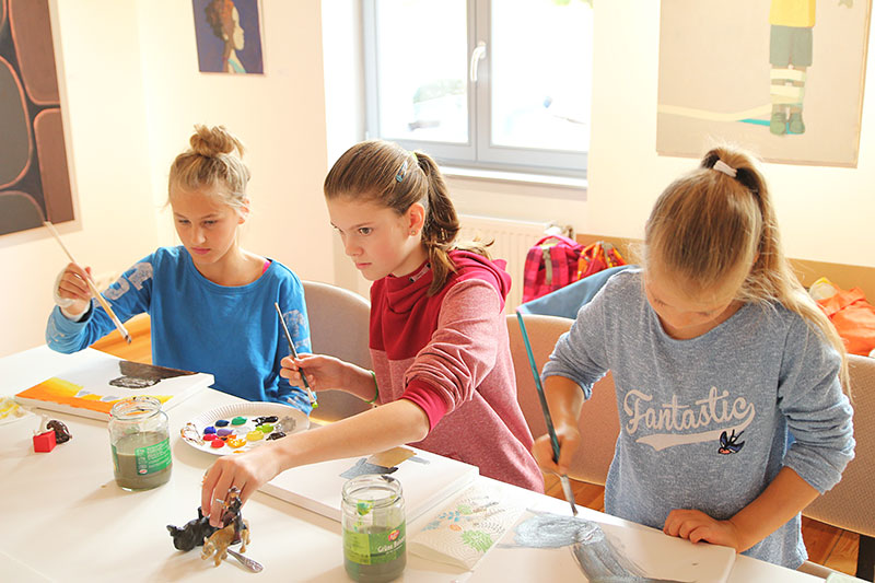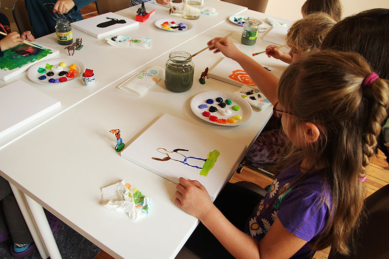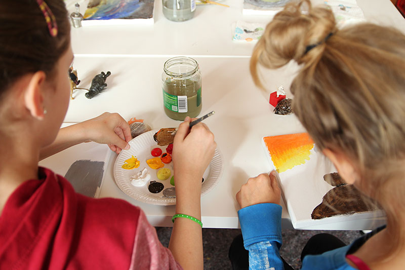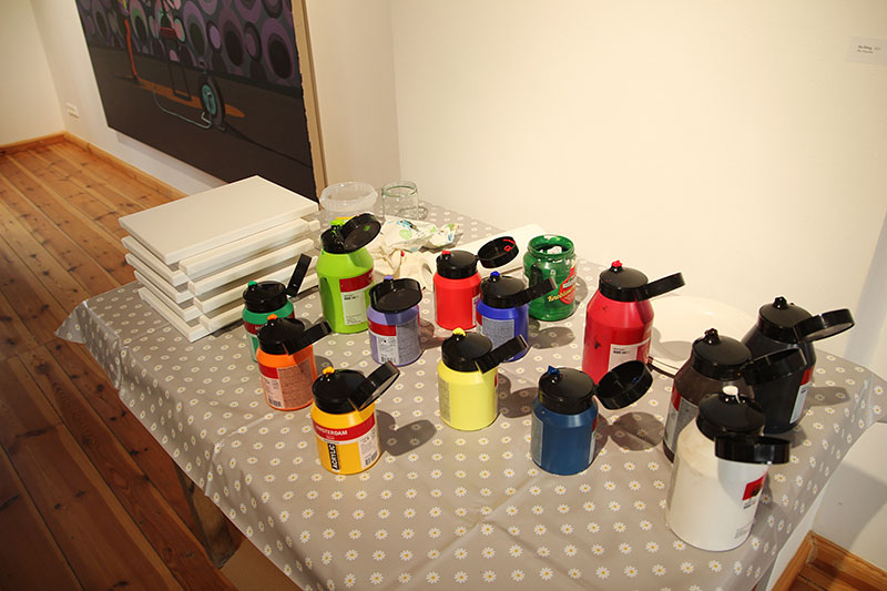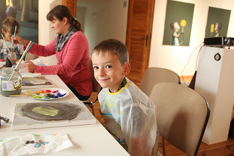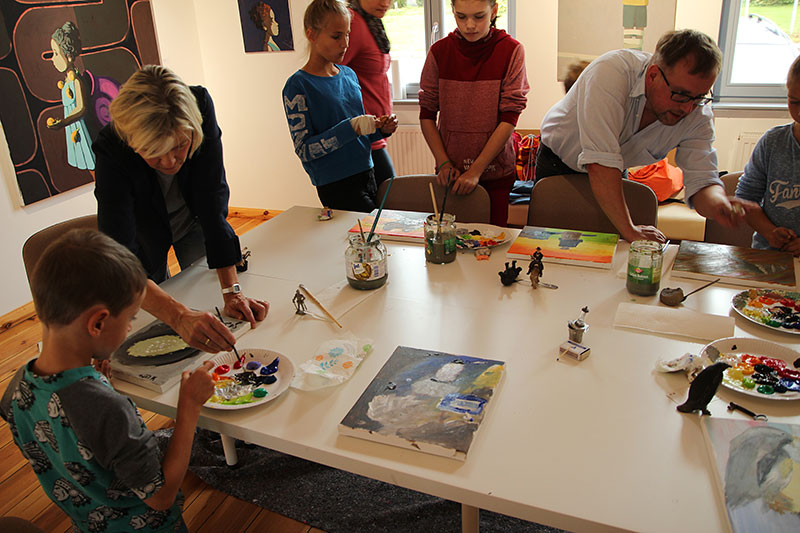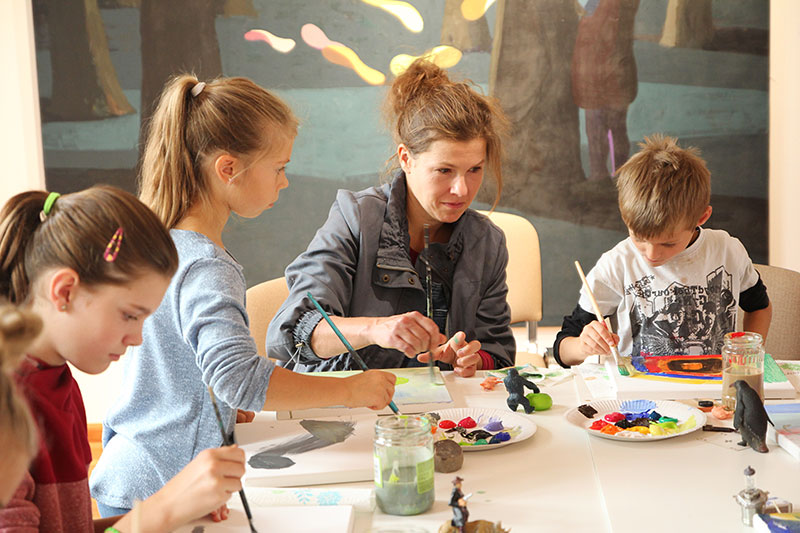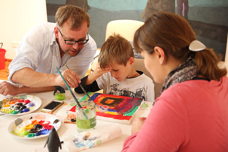 Interessierte Kinder, Jugendliche bzw. Junggebliebene waren herzlich eingeladen, mit dem Künstler über die Bilder seiner Ausstellung zu sprechen, Geheimnisse über Licht und Schatten und die Entwicklung der Bildmotive zu erfahren. Sie konnten selbst mit Pinsel und Farbe aktiv werden. Sven Ochsenreither brachte Leinwände, Acrylfarben und Pinsel mit. Um 14 Uhr sprach der Künstler in einem Vortrag über seine Arbeiten.
