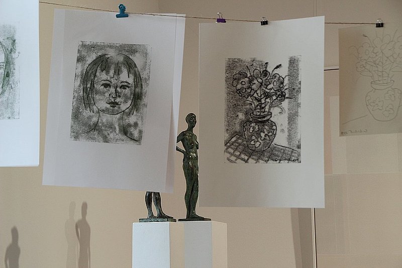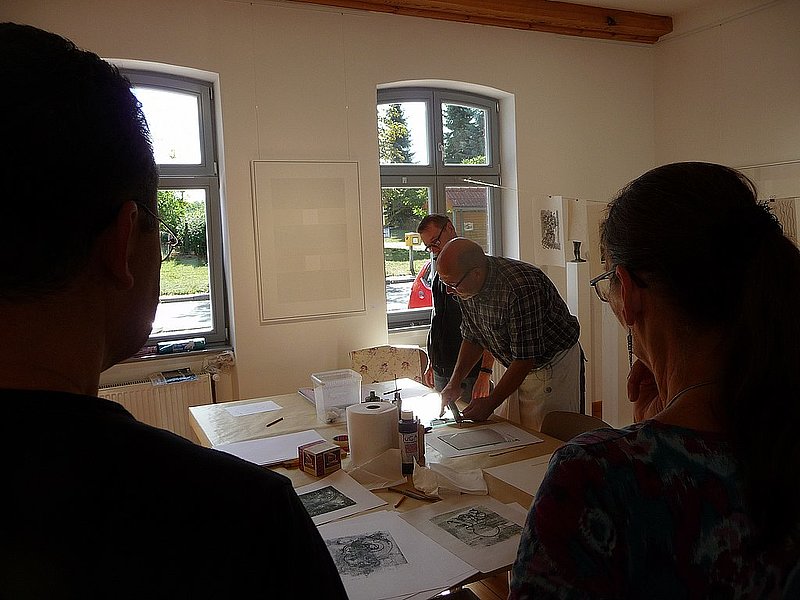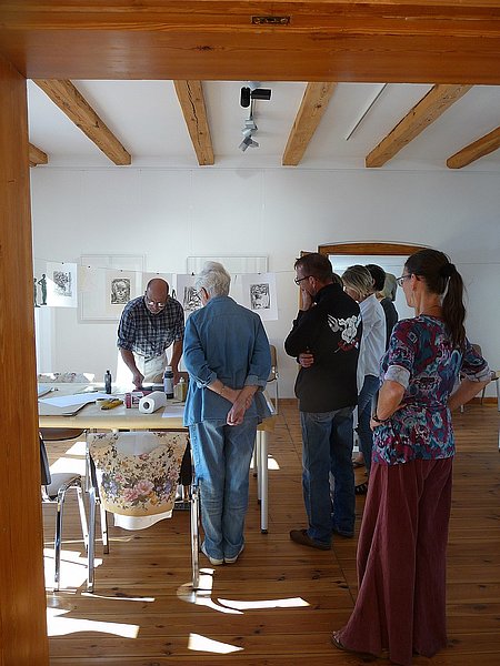 Drucken mit dem Bildhauer Claus Lindner Interessierte waren herzlich eingeladen, mit dem Künstler über die Werke der Ausstellung zu sprechen. Sie konnten selbst mit Walze, Farbe und Druckpapier aktiv werden und die interessante Technik der Monotypie kennenlernen. Claus Lindner brachte die Druckmaterialien mit und begleitete den Arbeitsprozeß, der allen viel Spaß gemacht hat und interessante Ergebnisse brachte.